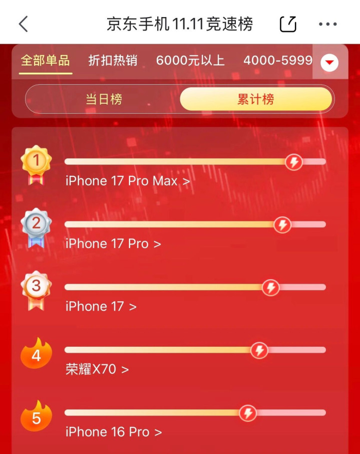 在京东双 11 手机销量竞速榜中,目前 iPhone 16 Pro 的实时排名是第五,仅次于 iPhone 17 系列和荣耀 X70。