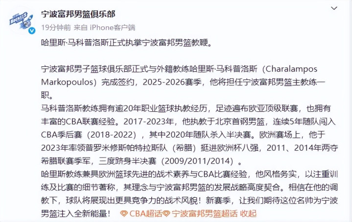 7月10晚上最新消息,宁波富邦男篮俱乐部官方发布:哈里斯·马科普洛斯正式执教宁波富邦男篮。