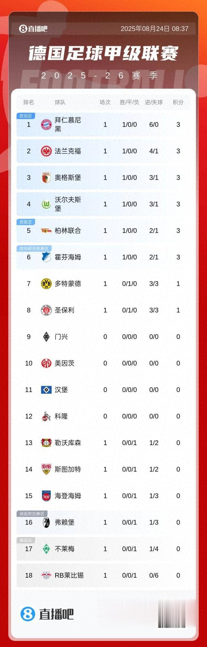 德甲首轮积分榜: 拜仁6净胜球基本锁第1, 多特1分暂第7药厂下半区